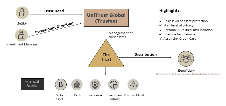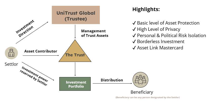 Suitable for: savvy middle-class or emerging high-net-worth individuals, offering high privacy, legal asset segregation, tax optimization, efficient estate distribution, and seamless, unlimited spending through a worry-free living trust solution.