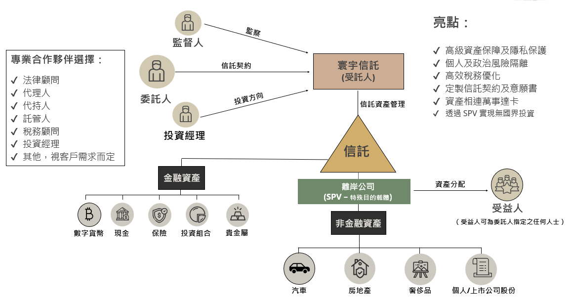 - 量身定制的傳承規劃:根據您的繼承計劃、家族情況和願景,寰宇信託提供個性化的信託結構設計,確保財富按照您的意願傳承。